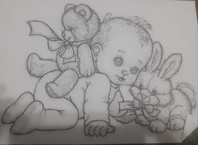Pintura em fralda manta de menininho, ursinho e coelhinho.